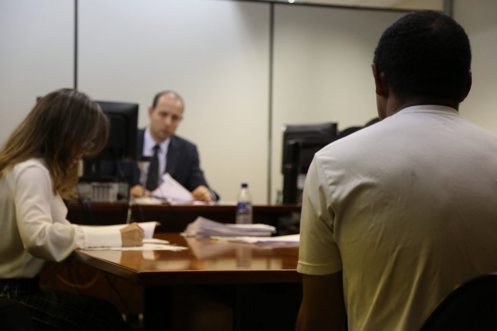 Homem preso em flagrante é apresentado a um juiz em audiência de custódia realizada no dia 1/07/2016, no Fórum Criminal da Barra Funda, em São Paulo (SP) Homem preso em flagrante é apresentado a um juiz em audiência de custódia realizada no dia 1/07/2016, no Fórum Criminal da Barra Funda, em São Paulo (SP)