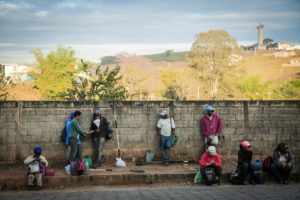 Trabalhadores rurais aguardam a chegada de transporte (ônibus ou van) para serem levados às fazendas de café nas quais trabalham sob condições degradantes e análogas à escravidão. Trabalhadores rurais aguardam a chegada de transporte (ônibus ou van) para serem levados às fazendas de café nas quais trabalham sob condições degradantes e análogas à escravidão.